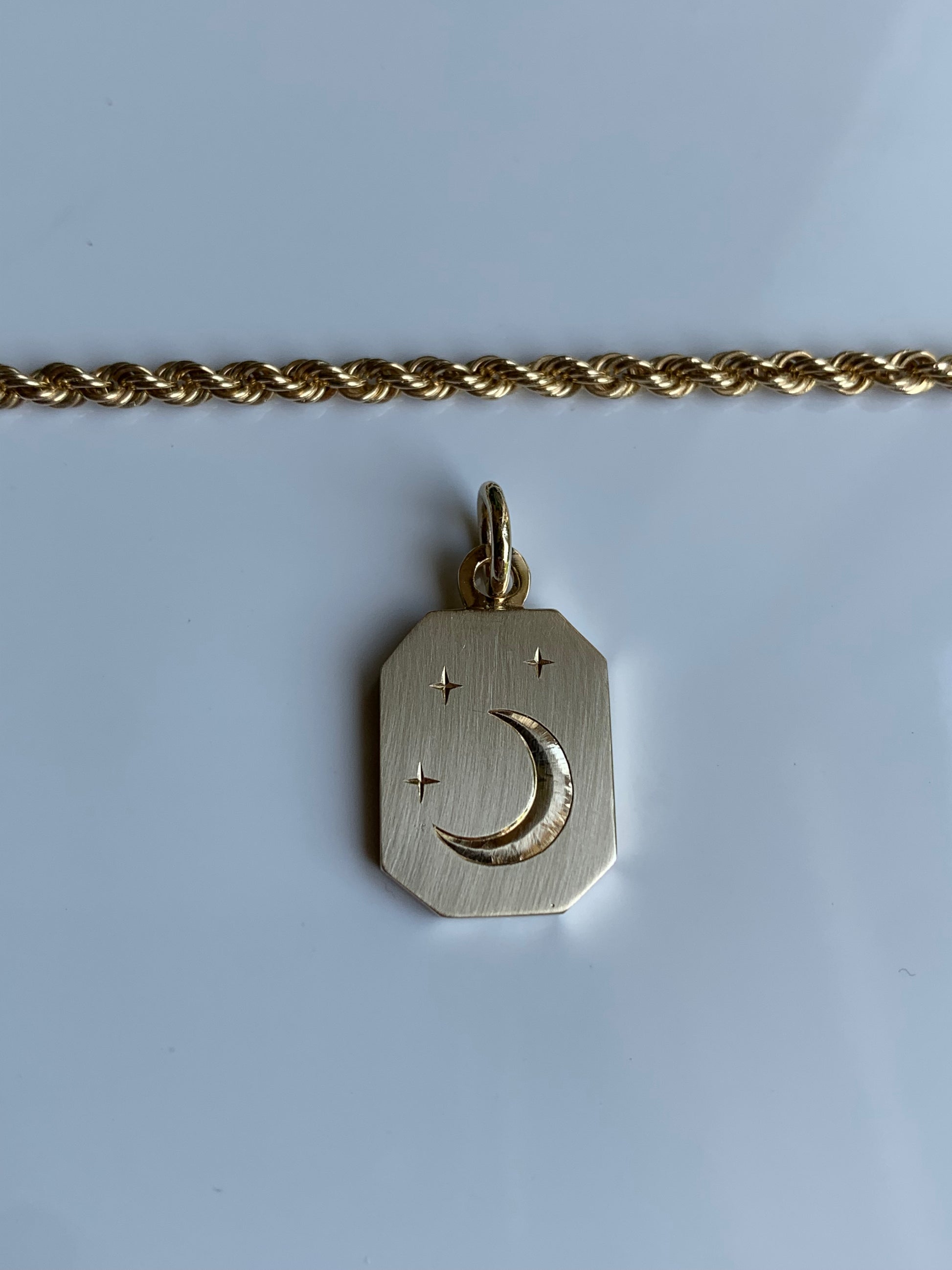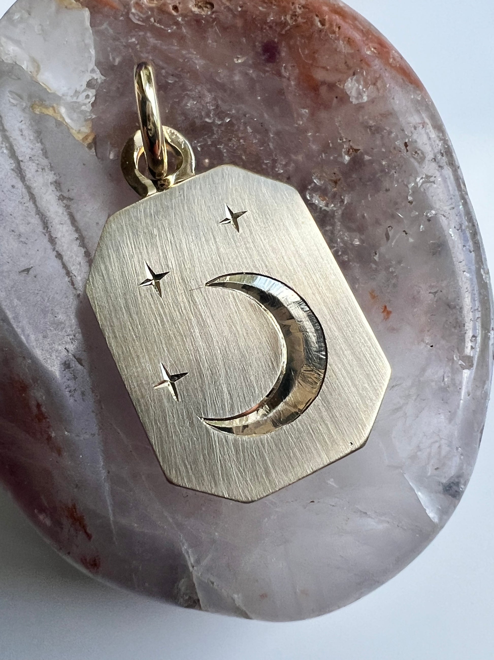 Hand-crafted in your choice of solid 14k or 18k gold, this celestial charm brings timeless elegance to any collection. Select from warm yellow or cool white gold to match your personal style. Each piece is hand-built to order, allowing us to ensure exceptional quality and attention to detail in every aspect of the design. Personalize your charm with custom hand-engraving on the back, transforming it into a meaningful keepsake or thoughtful gift. Whether you're drawn to celestial symbolism or simply appreciate fine craftsmanship, this versatile piece complements both everyday wear and special occasions. This is a made-to-order creation, please allow 2-4 weeks to create.
