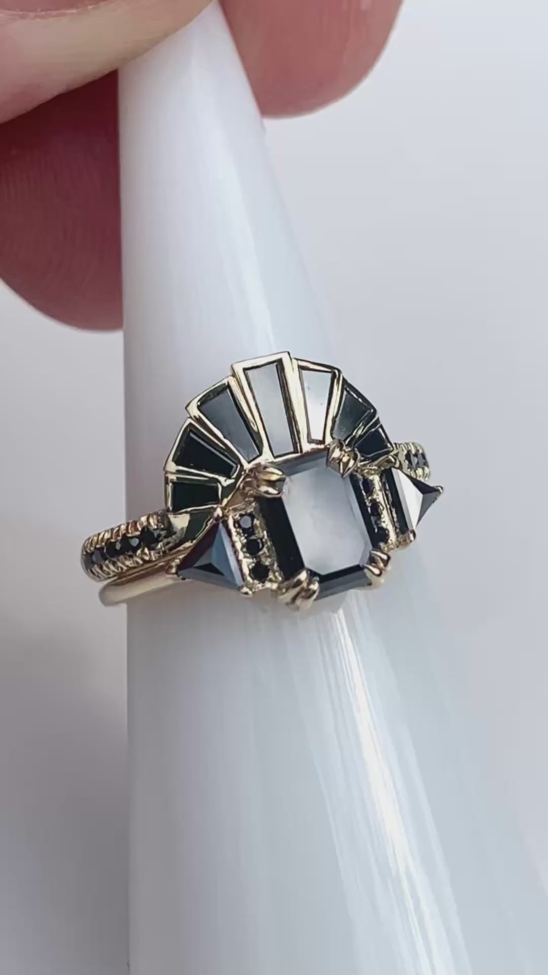 Hand-forged in 14k yellow gold, this bespoke contour band was created to embrace our client’s existing diamond ring with perfect precision. A fan of tapered black baguette diamonds radiates gracefully along the curve, each stone set by hand to echo the bold geometry of the centerpiece. The luminous gold and inky black creates a striking harmony and an elegant, dramatic accent that feels both timeless and unapologetically unique. The result is a very cool 1 of 1 ring combo.✨