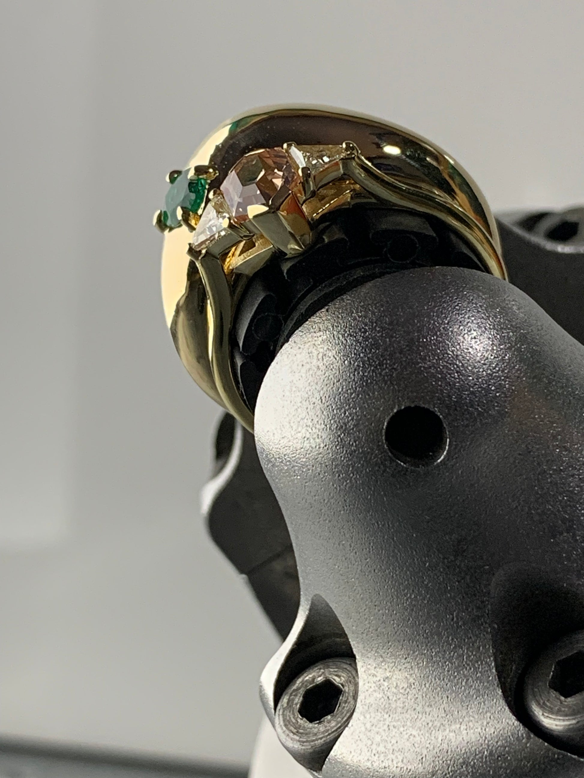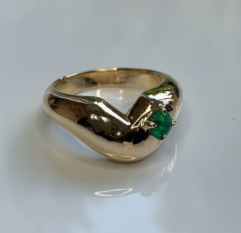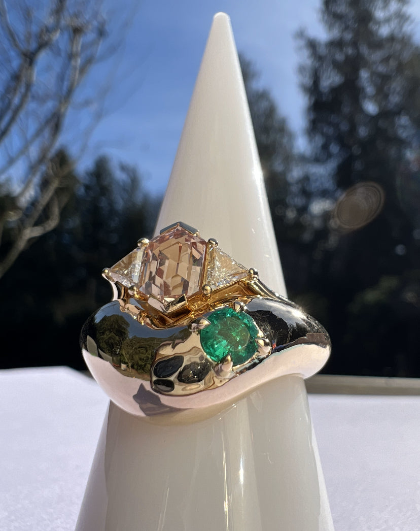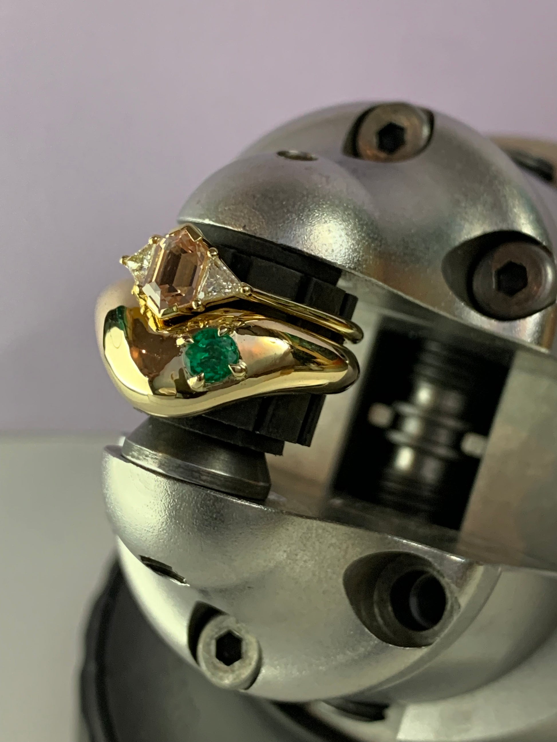 A hand-built contour stacking band built for a client using her heirloom emerald. The Ring stacks perfectly next to her engagement ring.
