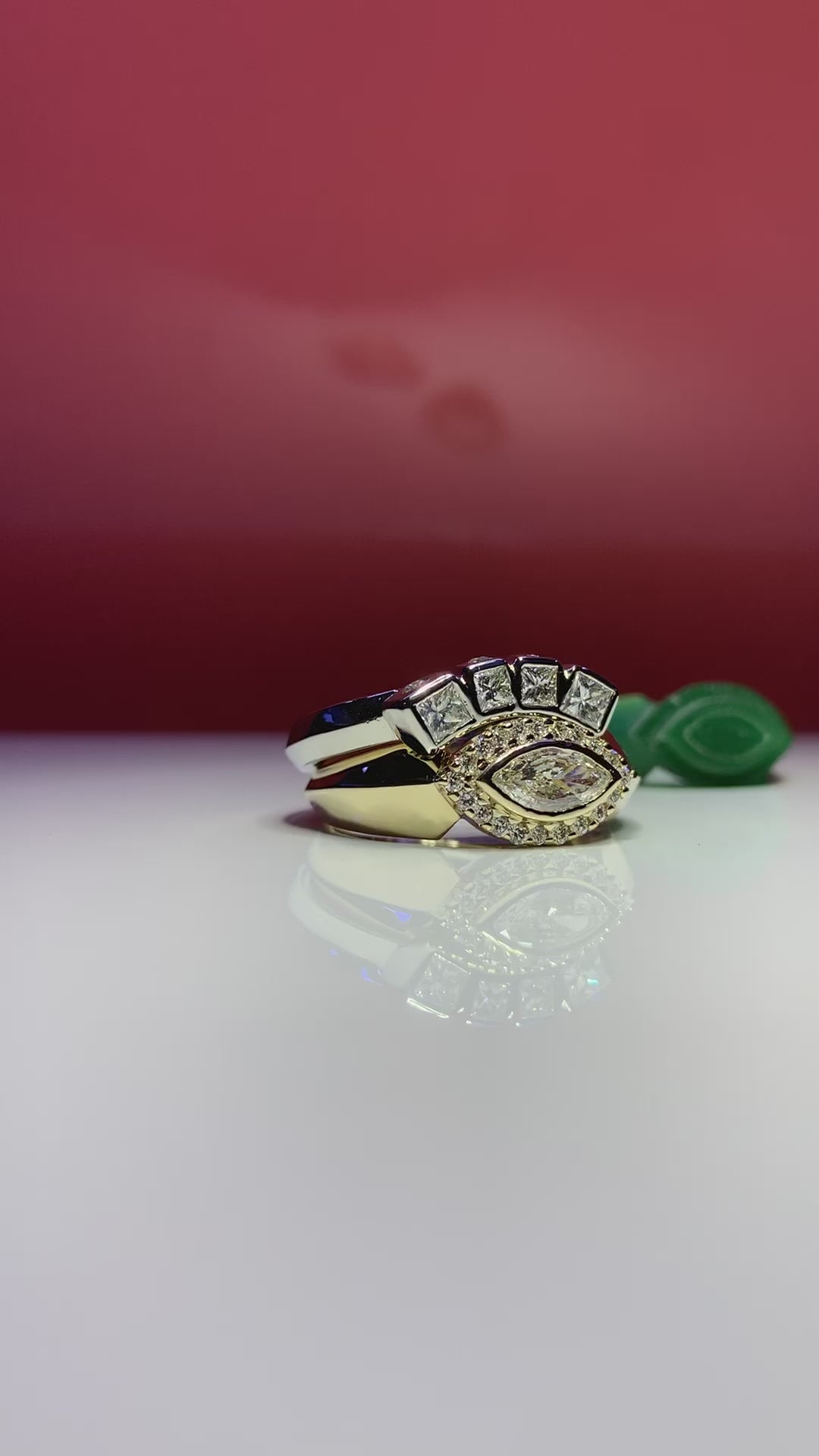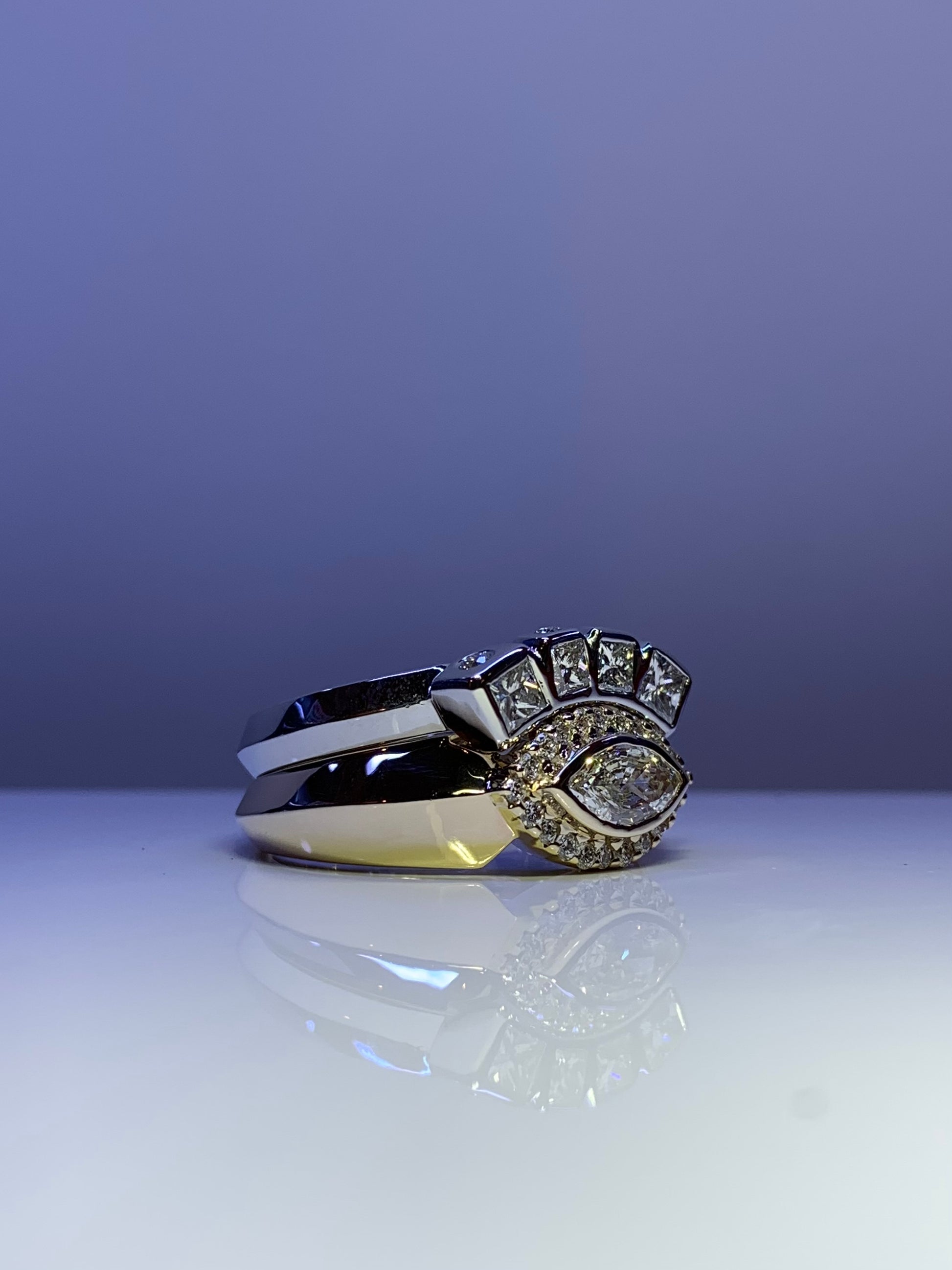 She wanted mixed metals so we did yellow gold for the main ring and white gold for the stacking band.