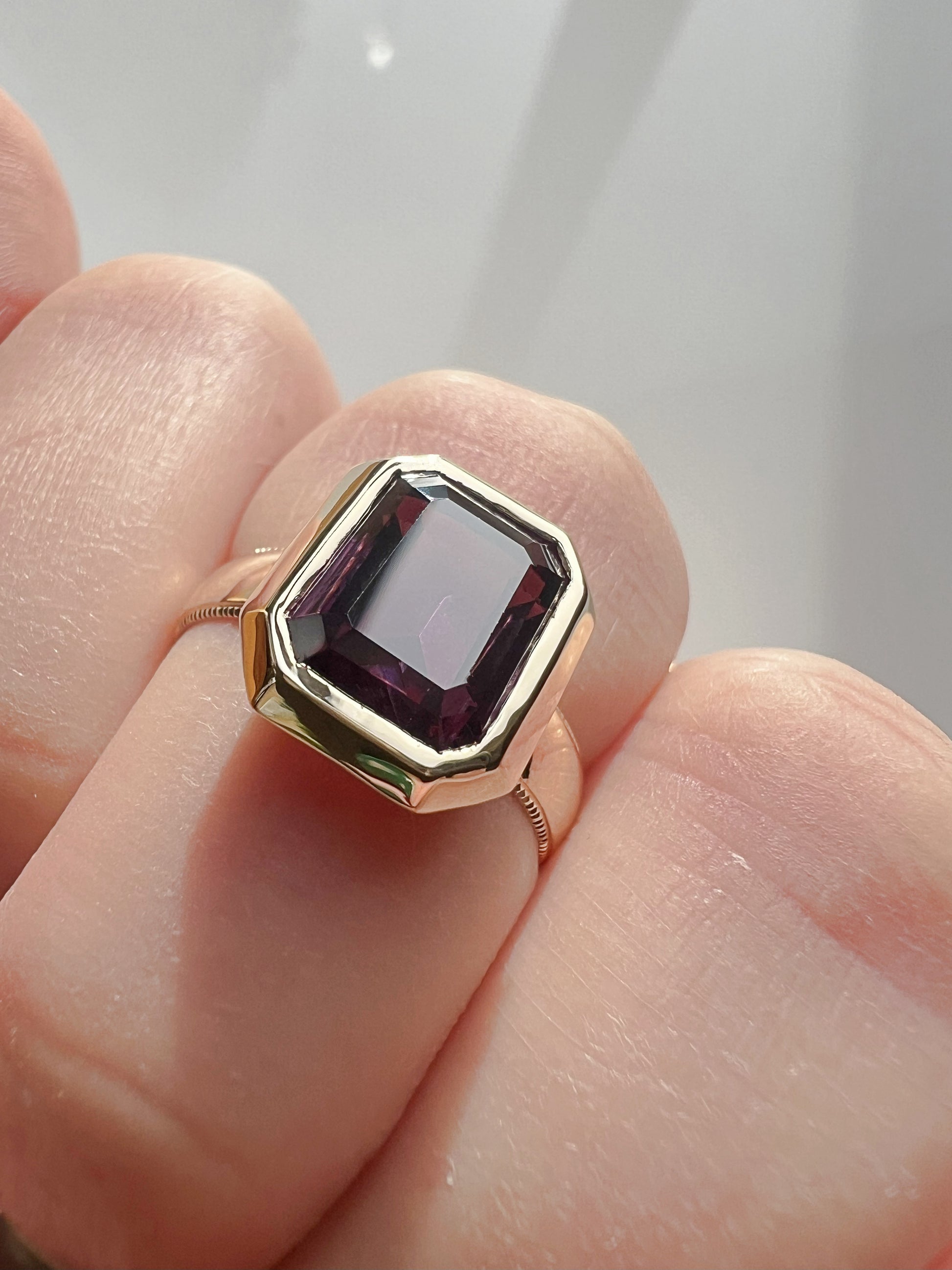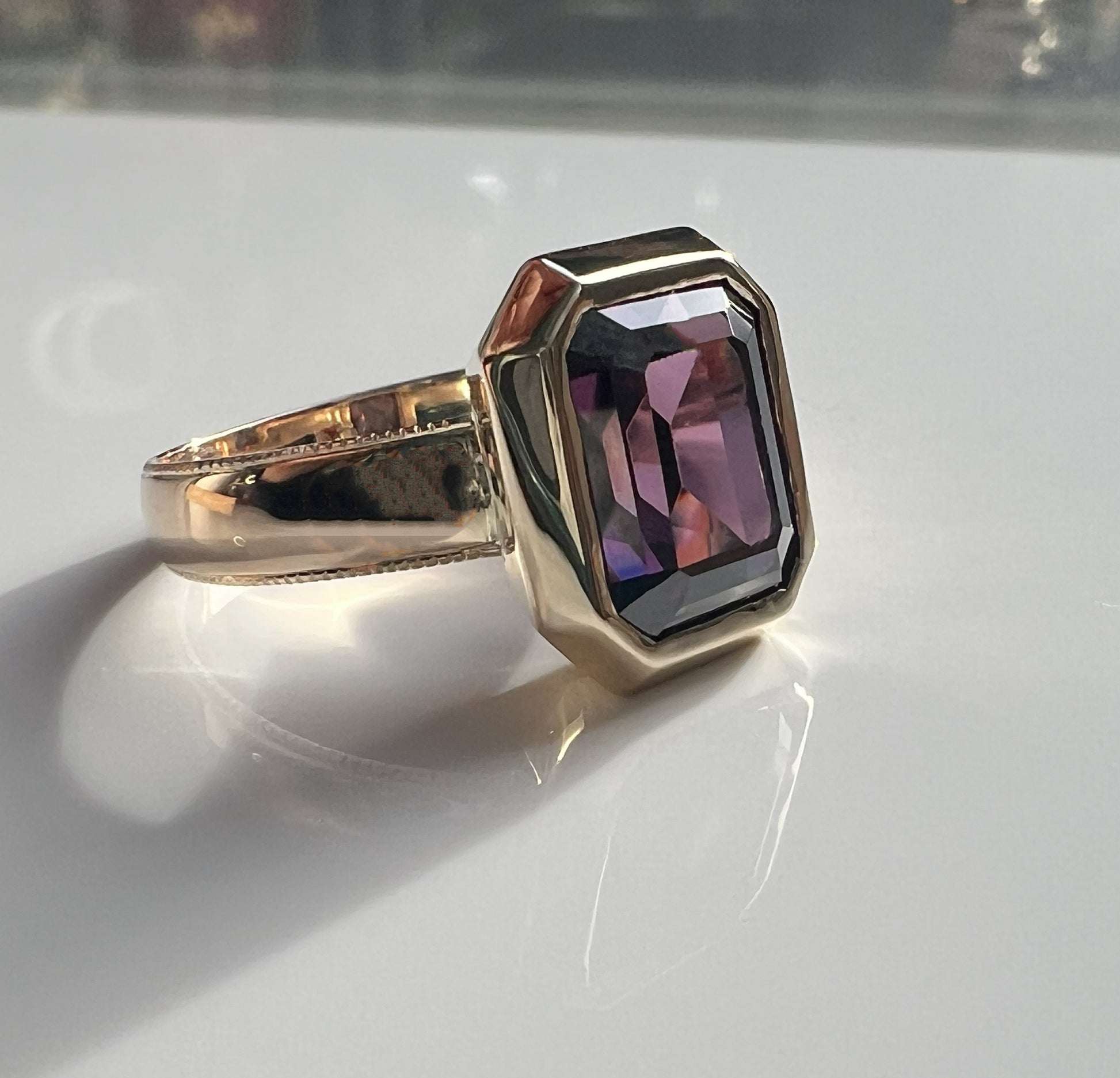 ✨This 4ct purple sapphire is set in a nice chunky handmade bezel and set on a 5mm half round band.