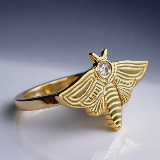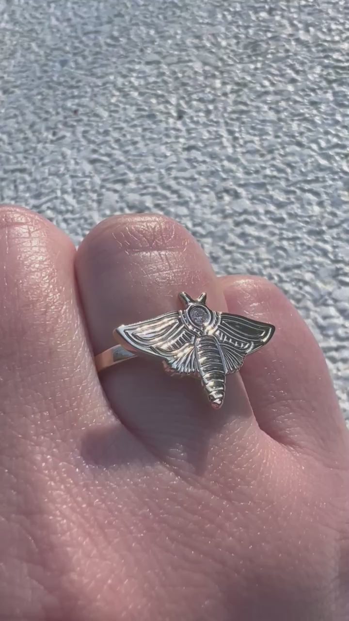 This bold design features a finely sculpted moth, crafted entirely by hand, with a 2.5mm diamond set like a glowing moon at its center. The moth rests atop a 2mm wide band, creating a striking balance of delicate detail and sturdy everyday wearability.